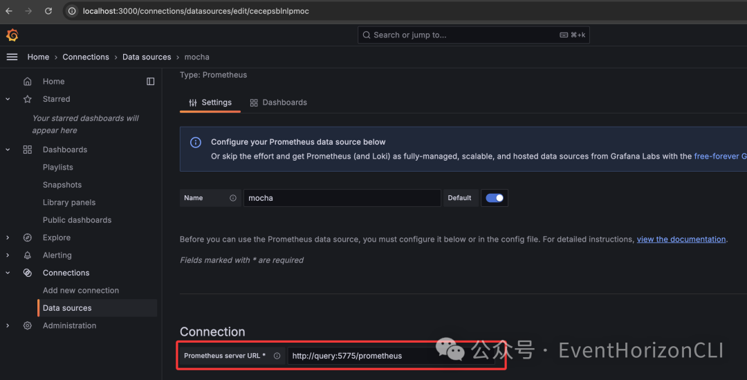 配置 Prometheus 数据源的 URL 为 http://query:5775/prometheus。