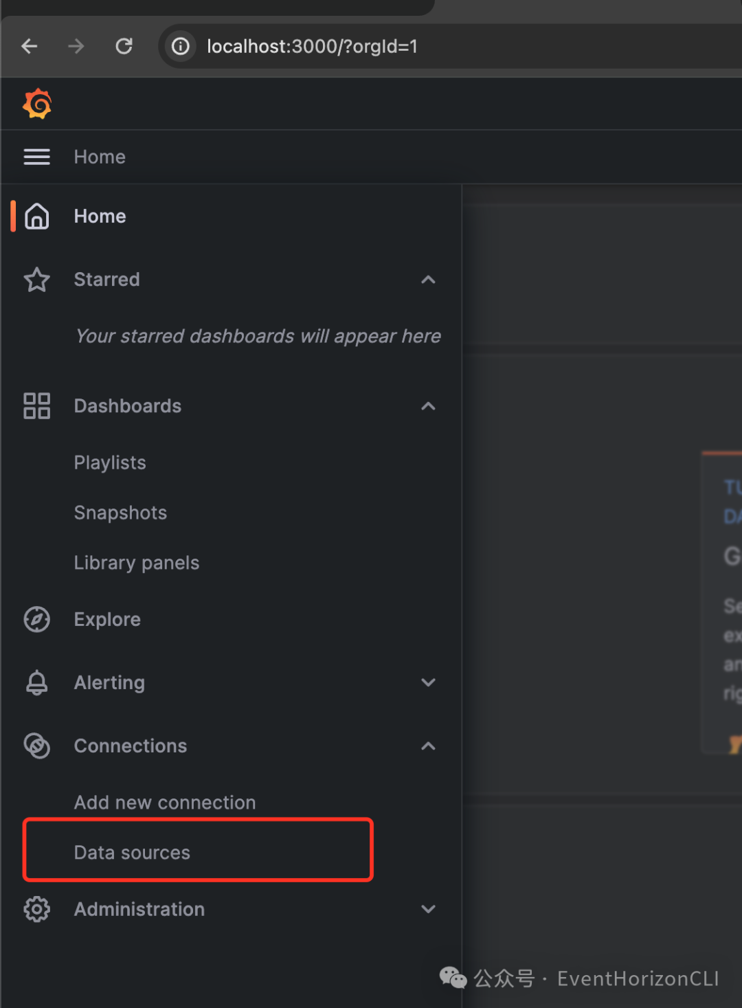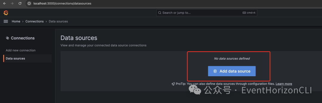 登录后,点击左侧的菜单,选择 Data Sources,然后点击 Add data source。