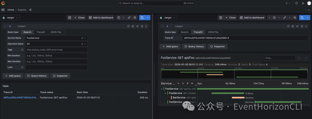 点击左侧的菜单,选择 Explore,然后选择 Jaeger 数据源,即可看到 Trace 数据。