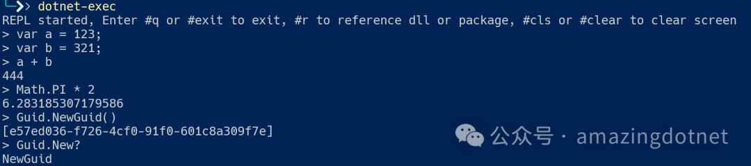 在遇到不熟悉的 API 的时候也可以通过在代码最后加入一个问号 ? 来获取代码提示(目前代码提示做的不太好,没有 inline 的 code completion,后面看大家需要再做优化吧,也可以先使用 csharprepl 项目,会有 inline 的 code completion 代码提示效果更好),如上图中的最后一个输入是 Guid.New?,代码提示是 NewGuid