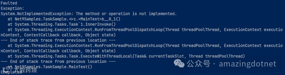 这里先将状态设置为了 Cancelled 后面再设置的时候就会失败,我们先用 TrySetFromTask 来看下返回结果,再尝试直接用 SetFromTask,输出结果如下: