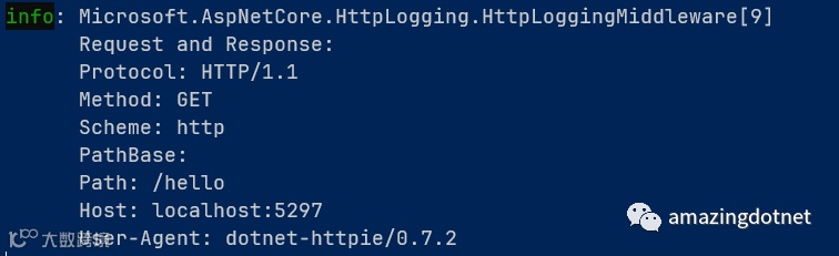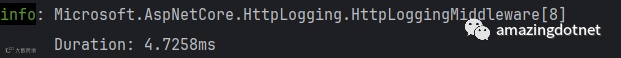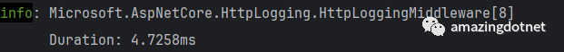 HttpLoggingFields 中新增了一个 Duration 枚举值,会记录请求处理的耗时,并且在 All 中包含了,输出日志如下: