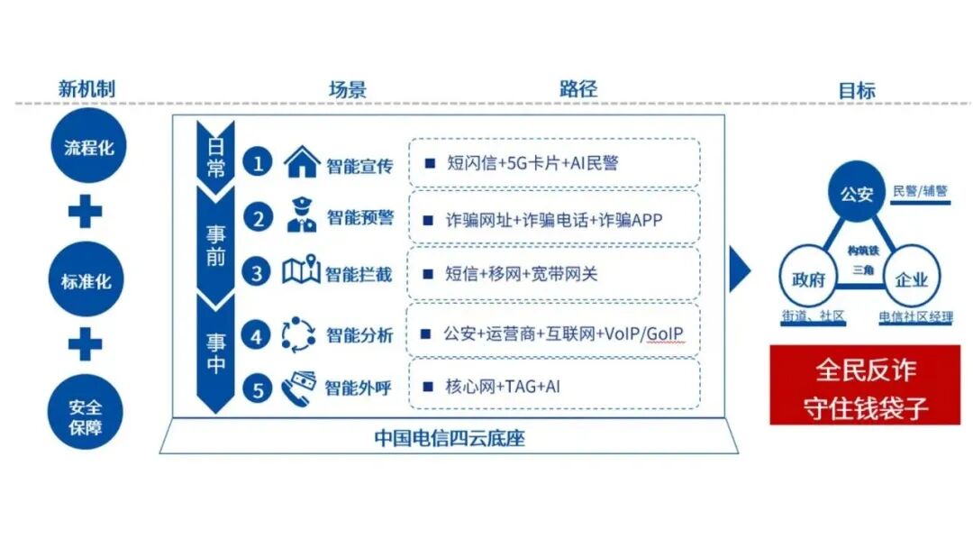 以中国电信先进的通信能力为底座,反诈呼入/呼出需求为抓手,提供全覆盖、智能化的全流程反诈解决方案。