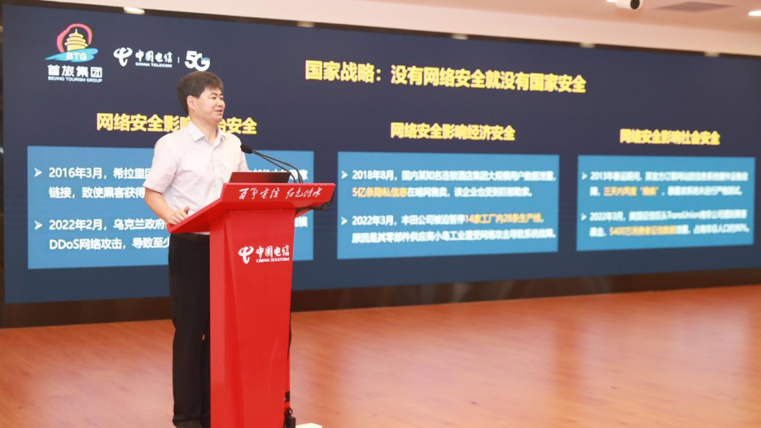 中国电信集团政企信息服务事业群总经理潘天舒、文宣行业事业部总裁徐守峰和首旅集团总经理白凡、副总经理吴金梅、副总经理冯伟出席本次活动。首旅集团多部门人员及集团企业多位负责人一同参加,与中国电信方网络安全及数字化领域专家深入交流、学习企业数字化转型过程中所面临的网络安全问题与数字化转型技术经验。