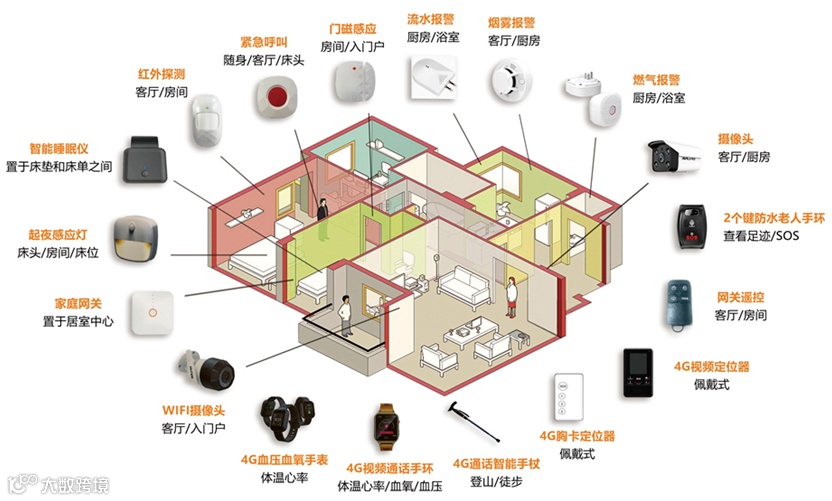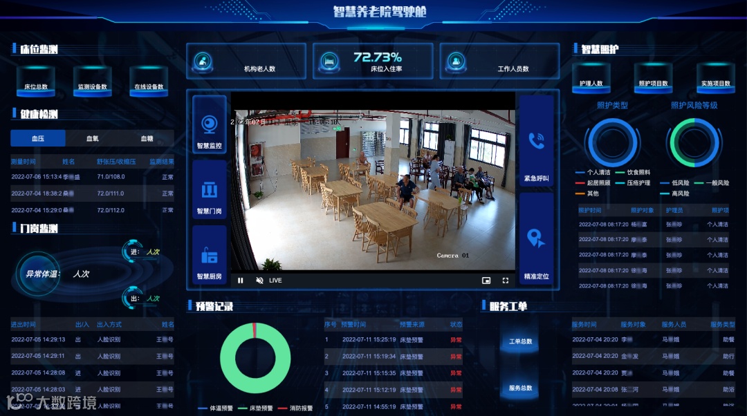 通过平台,养老院可以采用 5G+VR 的方式,提供便捷选房服务。在楼梯、大门等关键位置,布设AI摄像头,通过防跌倒算法,监控老人行为安全,借助边缘计算提升预警实时性。通过组建睡眠雷达、智能环境监测等传感器集群,提升信息感知能力,不仅能够实时监测水、电、网、气等环境安全,还可以全面监测老年群体位置、活动轨迹和情绪变化。