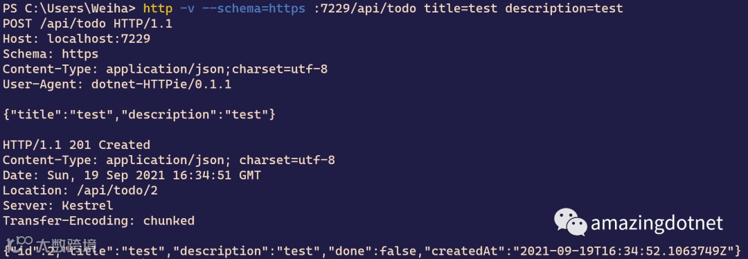对于创建一个新 todo 的 POST API 也可以使用 dotnet-httpie 来方便的请求