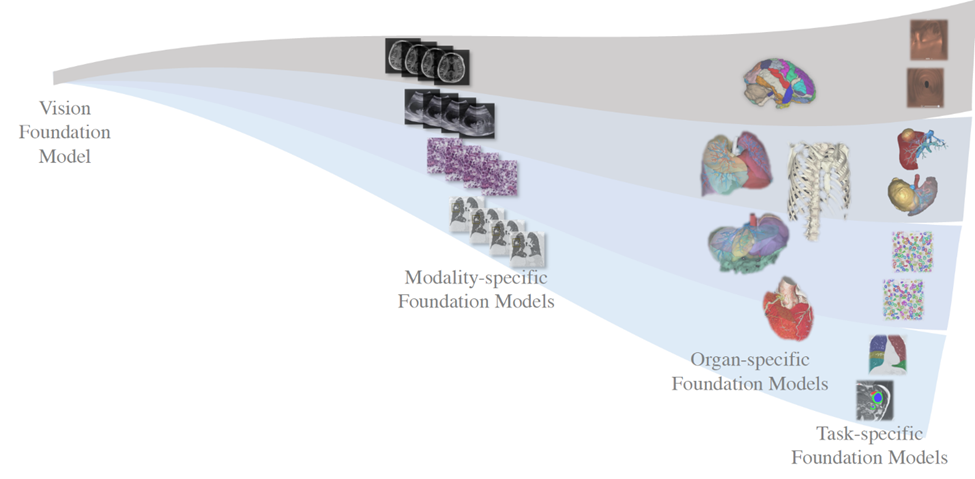 在医学图像分析领域,特定任务的模型仍然是主要方法,尤其是在计算机辅助疾病诊断等实际应用中。由于医学中使用了多种不同的成像模式,开发医学基础模型面临着重大挑战。这些成像模式与自然图像有很大的差异,并基于一系列以物理为基础的特性和能源源,例如利用光、电子、激光、 X 射线、超声、核物理和磁共振等。所产生的图像涵盖了多个尺度,从分子和细胞到器官系统和整个身体。因此,通过组合这些多模态图像进行训练来开发一个统一的多尺度基础模型可能是不可行的。OpenMEDLab 展示了各种基础模型及其在医学图像分析中的应用,从特定模态的模型到器官和任务特定的模型(请参阅基于预训练医学图像基础模型的项目)。