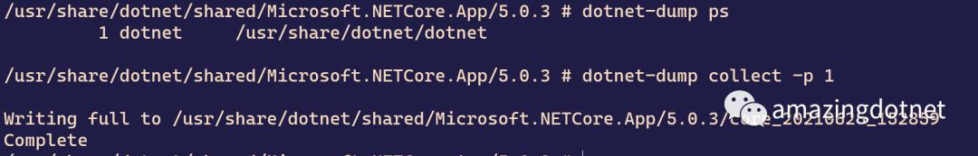 我们可以先切换目录到 /usr/share/dotnet/shared/Microsoft.NETCore.App,然后 ls 查看当前的 runtime 版本,切换到版本目录下即可找到 createdump