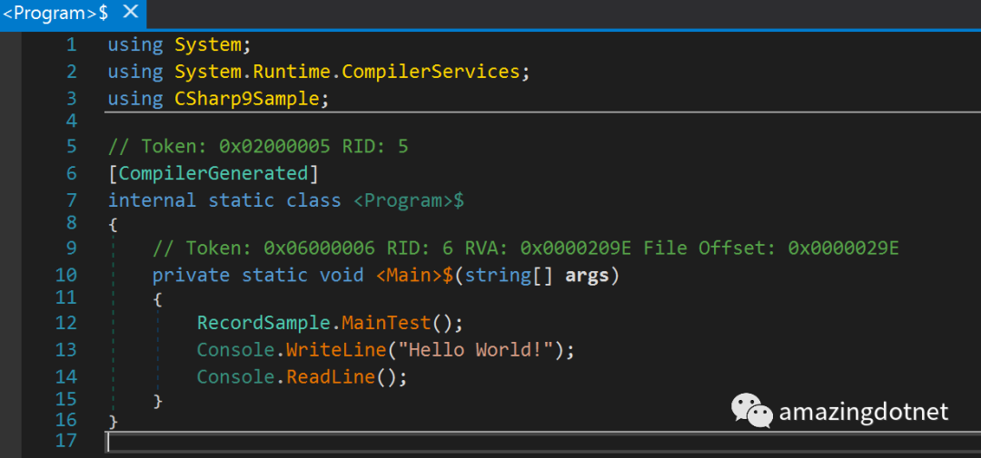 实际会生成一个没有命名空间的 <Program>$ 的类型,类中定义的有一个名称是 <Main>$ 的静态方法