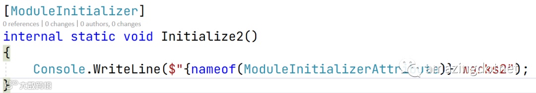 Source Generator 除了上面的分部方法之外,还引入了一个 ModuleInitializer 的概念,就像它的名字,模块初始化器,当用到某个模块的时候就会调用对应的 ModuleInitializer 方法进行初始化操作