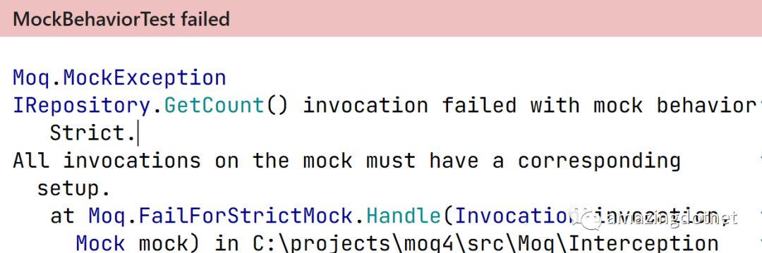 在声明 Mock 对象的时候可以指定 Behavior 为 Strict,这样就是一个**"真正"**的 mock 对象,没有设置预期行为的时候就会抛出异常,示例如下:
