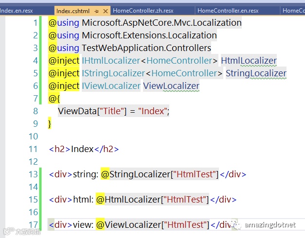 IStringLocalizer 和 IHtmlLocalizer / IViewLocalizer 都可以直接从依赖注入服务中获取, IStringLocalizer 和 IHtmlLocalizer 推荐使用强类型的方式,也就是下面示例的使用方式,使用方式和 ILogger 类似