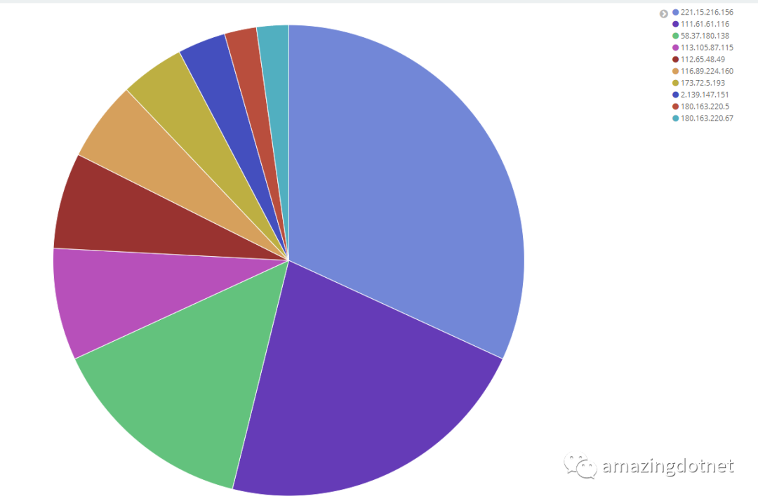 拿上篇文章的图来借用一下,下面是 kibana 基于日志的 RequestIP 来绘制的前十个访问最多的 IP 地址