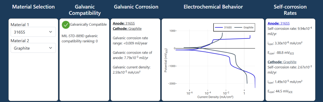 为了补充最近对MIL-STD-889的D版修订,Acuity Corrosion Technology开发了一款免费的在线工具(详细请点击“阅读原文”),以帮助进行“可行/不可行”材料选择的快速视觉分析。此外,该在线工具还作为资源,用于访问和分析在标准修订期间测量的额外电化学行为,但由于数据量原因未包含在已发布的标准中。这些数据包括所有材料的电化学电位、自腐蚀率以及极化行为,还有所有材料对的电偶腐蚀率。通过交互式图形提供极化曲线。