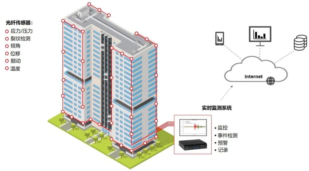 光纤传感系统通过对压力、应变、裂缝、位移、倾角和振动的连续监测,对日益严重的结构问题提供预警,并降低故障风险。利用光纤传感技术能够经济高效地远程监控建筑结构,向决策者提供准确可靠的数据信息。