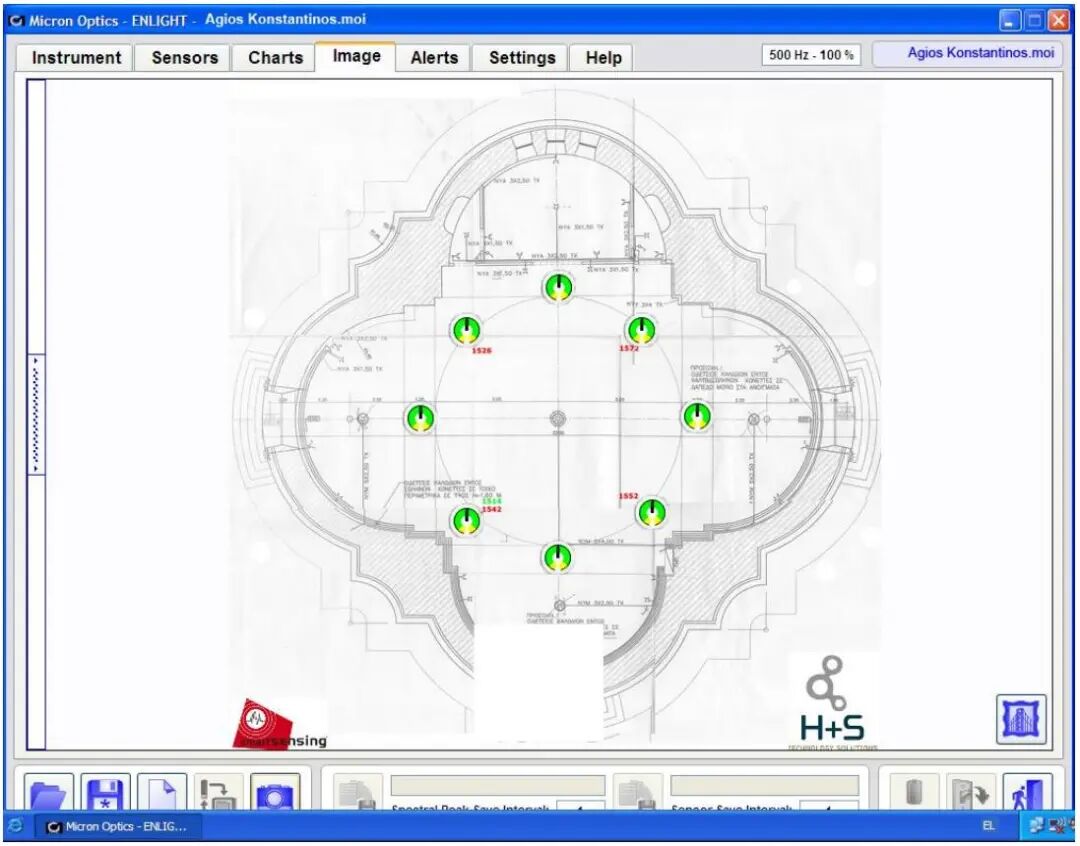 软件界面示例显示多个应变、温度和加速度传感器监测点,所有传感器均指示“绿色”状态