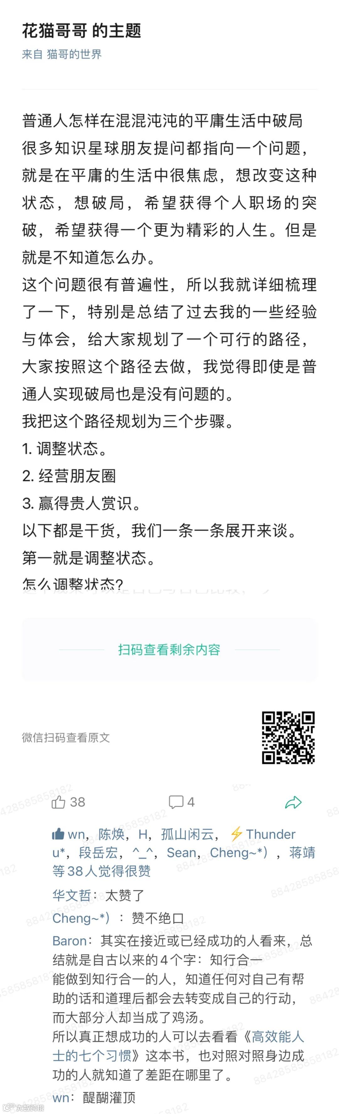 PS:我的知识星球中每周有2-3篇热点政经分析文章,一些不方便在公开场合的深度分析在星球能看到,同时我也会尽量回复大家私聊的问题,感兴趣的朋友长按图片或者扫描二维码均可加入,欢迎大家来星球一起交流。 下图是我最近关于普通人如何破局的思考: