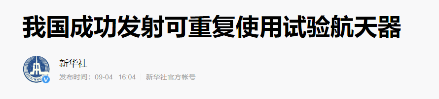 9月4日,中国在酒泉卫星发射中心用长征二号F运载火箭,成功发射了一枚可以重复使用的试验航天器,该飞行器将会在太空飞行一段时间,像飞机一样返回预定着陆场。