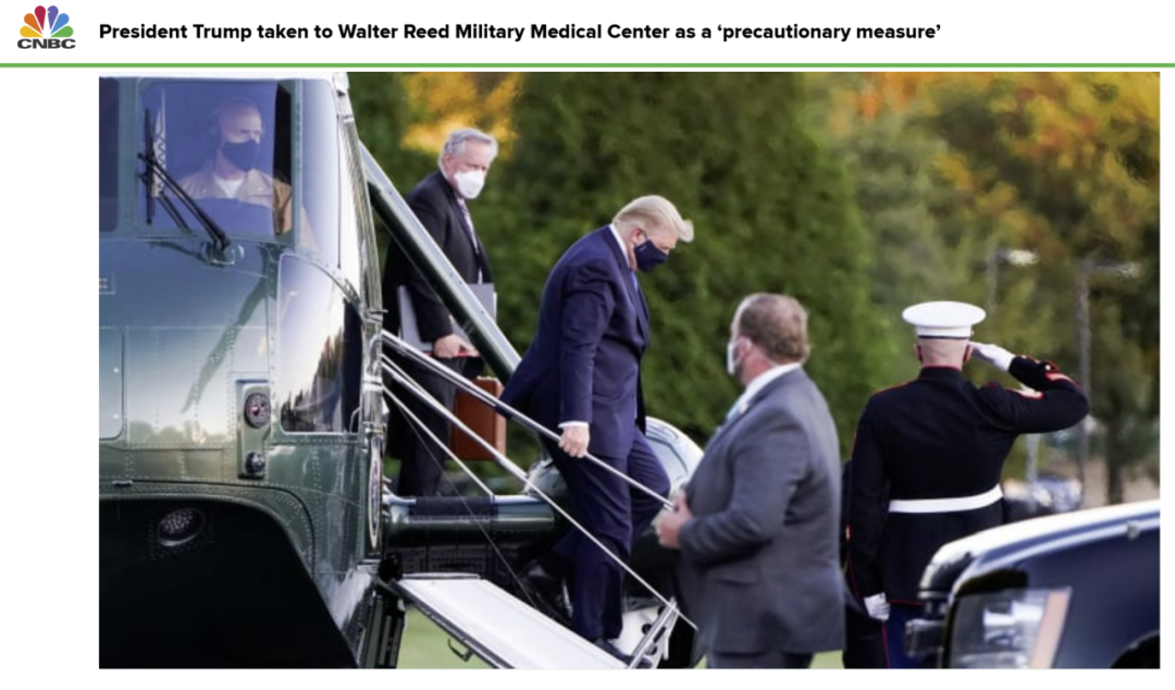 所以,在特朗普宣布自己确诊之后不到24小时,白宫宣布特朗普将暂时离开白宫入住华盛顿郊外一个国家军事医疗中心。