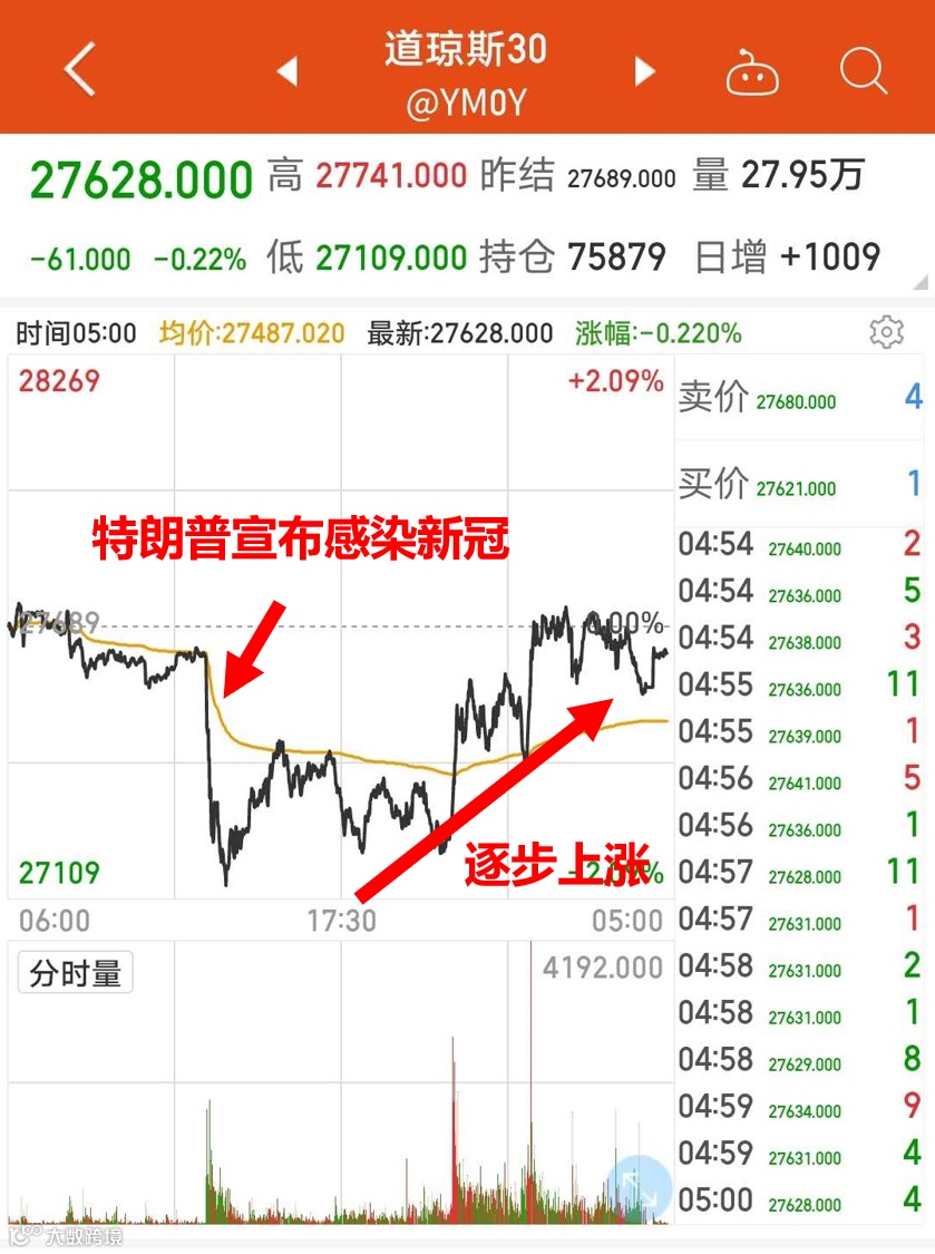 在特朗普发推宣布自己确诊新冠之后,美股道琼斯指数期货当场跳水超过2%,股指跳水同时引发避险资产价格大幅度上涨——国际黄金价格从1888元(伦敦金价)飞快拉升到1918元。