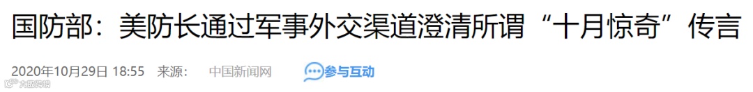 10月29日下午,在举行的例行记者会上国防部发言人吴谦主动回应:美防长埃斯珀通过军事外交渠道专门就此澄清,表示报道与事实不符,美防长称无意对华制造军事危机。