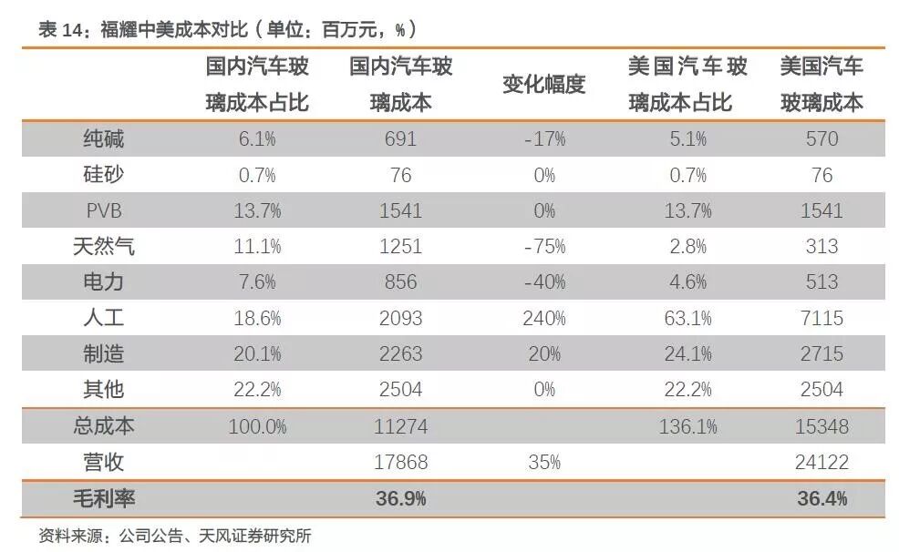 综合下来,福耀美国工厂的成本比中国高36%左右,但美国汽车玻璃市场是一个竞争并不激烈的市场(本土的PPG退出市场后,只剩福耀、旭硝子等外国厂商),产品售价比中国高35%,从海外进口又不现实(玻璃运输昂贵),这样一抵消,福耀美国工厂的毛利率跟中国差不多。