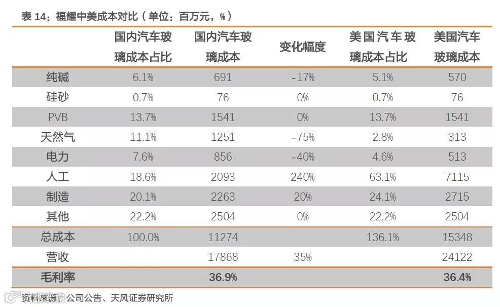 分拆来看,福耀汽车玻璃成本主要构成为人工成本(18.6%)、制造费用(20.1%)、PVB膜(13.7%)、天然气(11.1%)、电力(7.6%)、纯碱(6.1%)、硅砂(0.7%)等。这里面,人工美国是中国的3倍,天然气美国是中国的25%,电力是国内的64%,其他则相差不大。