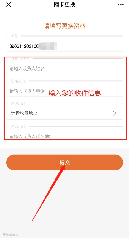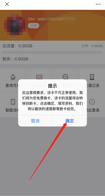 在充值通道输入您的卡号,会弹出更换新卡的窗口(如下图),点击进入提交资料即可,我司会在24小时内为您发出您的新卡,旧卡剩余流量转入新卡,运费由我司承担。