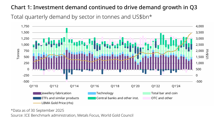 投资需求驱动了整体的需求增长,尤其是在2025年第三季度的表现尤为突出,显示出投资者对黄金投资的持续兴趣。