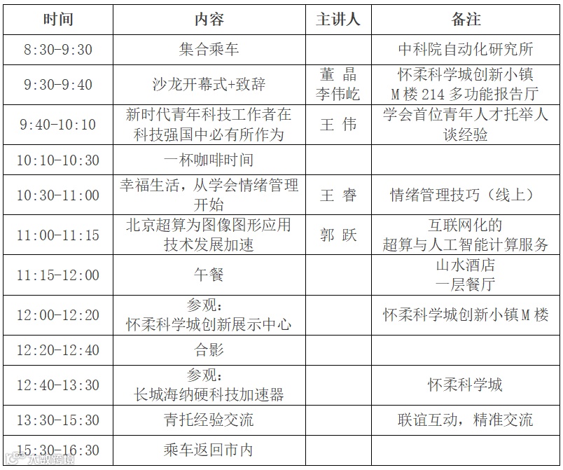 交通:去程:7日早8:30,在中科院自动化所东一门(中关村东路95号)乘车前往怀柔科学城,返程:下午16:30 到达中科院自动化所东一门