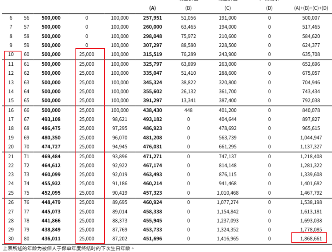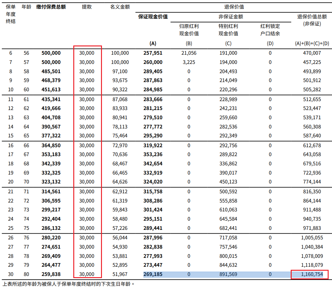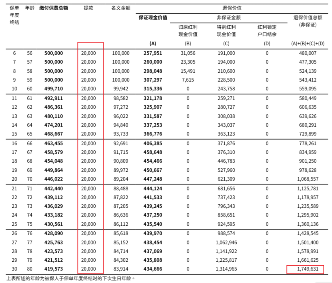 在“566”提取情况下,即是五年缴费完,在保单第六周年日开始,每年按照总保费的6%,也就是500000 * 6% =30000美金进行提取;