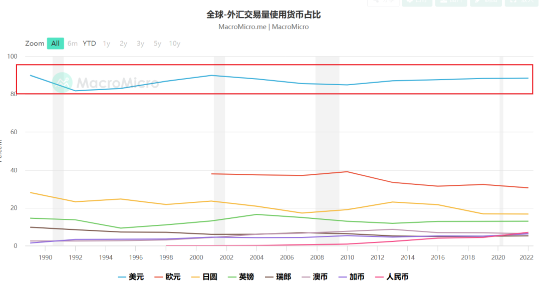 在全球外汇交易中,美元占比长期占比超过80%以上(国际清算银行统计数据) ,而欧元占比仅为 32%左右,人民币占比 3%左右;