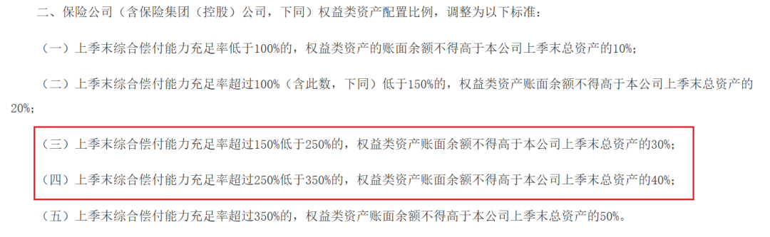 明确上调保险公司的权益资产配置比例上限,最高入市比例可达40%;