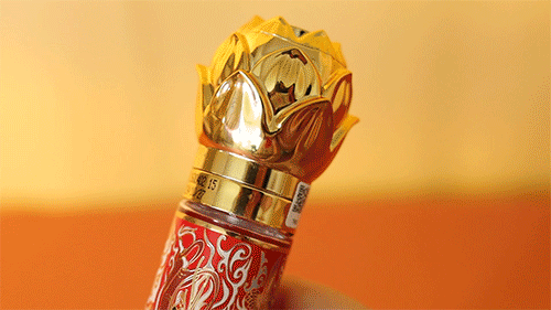 礼盒上印敦煌飞天仕女图,瓶身刻画锦鲤、白鹿吉祥纹饰,瓶盖处为立体莲花设计。