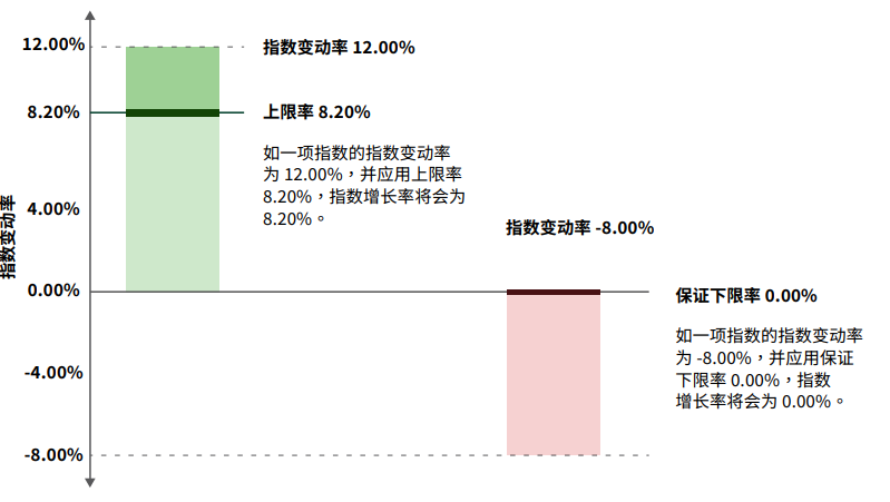 如上图,假设某一款产品的上限率为8.2%,当某指数变动率为12%的时候,由于上有封顶8.2%的原因,当年的【指数户口】收益率就是8.2%;