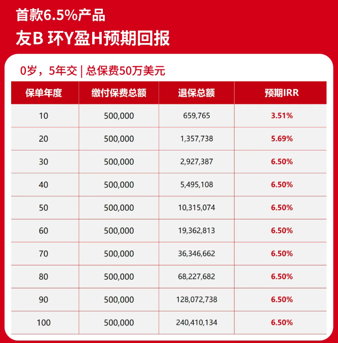 我们以一个“0岁、年交10万美金×5年,共50万美金”的客户为例: