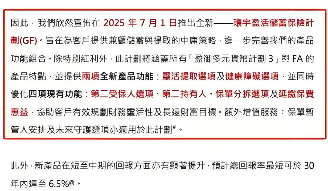 而作为6.5%时代下的首款产品,友邦的新品「环宇盈活储蓄保险计划」就将会在7月1日和大家见面。