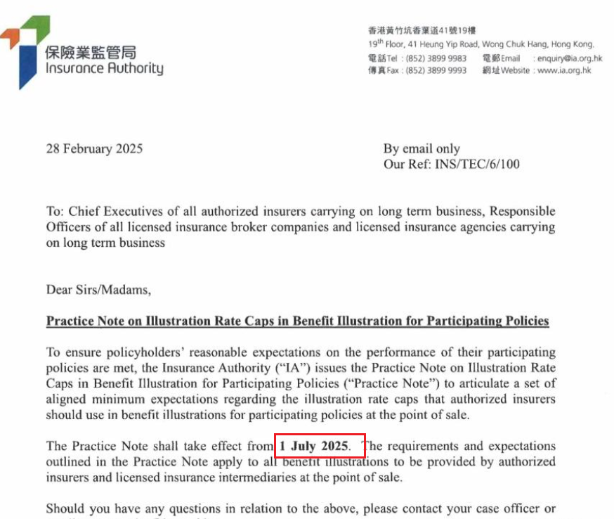 要求自2025年7月1日起,港元分红保单的客户预期收益率不得超过6%,非港元(包括美元)分红保单的客户预期收益率不得超过6.5%。