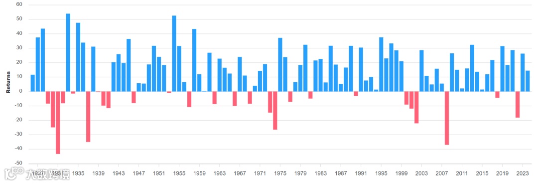 下面这张图,是1929到2023年的标普500指数年度表现。