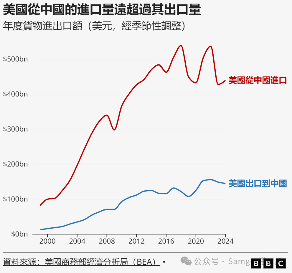 其贸易失衡规模在2024 年达到历史新高,商品和服务贸易逆差总额为9184亿美元,较2023年增长17%,创下1960年以来第二高水平,尤其是中美之间的贸易额一直都是相差甚远。