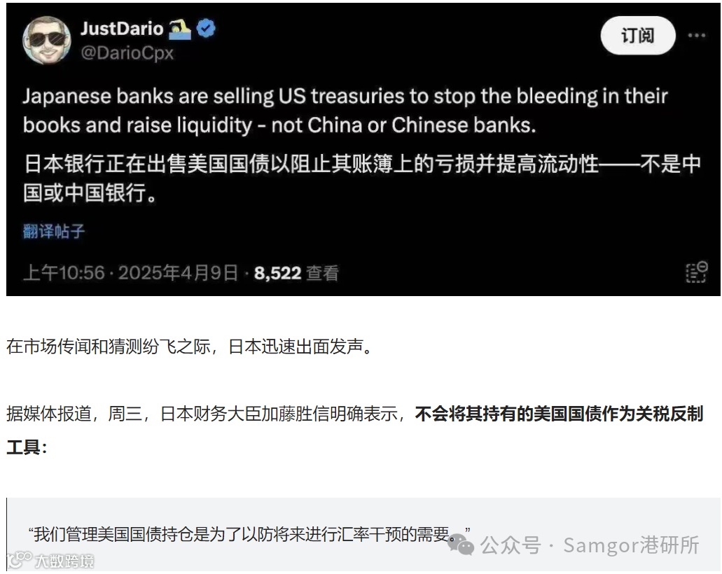 我们看看这两天10年期美债的收益率,出现了诡异的不降反升的现象,因为面对如此混乱的局面,大家都在抛售美债,就连日本近期也在偷偷抛美债,当然他们说是为了防御汇率风险,不是因为GS反制。