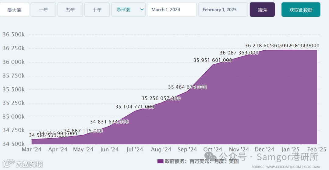 拜登任内,凭借三轮大规模刺激计划推高政府杠杆,2024年,联邦债务规模已达 GDP的123%,年度利息支出突破1.3万亿美元,远超国防预算。