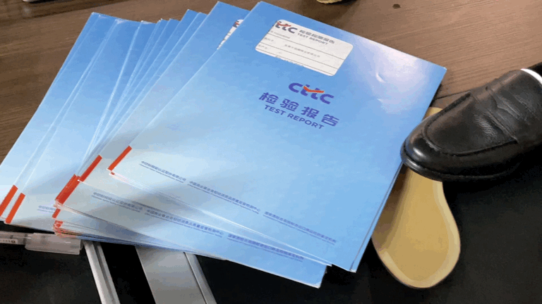 每双鞋还会多方测试,比如拉力、耐曲折、差色掉色、环保等,皮料也有检测报告。
