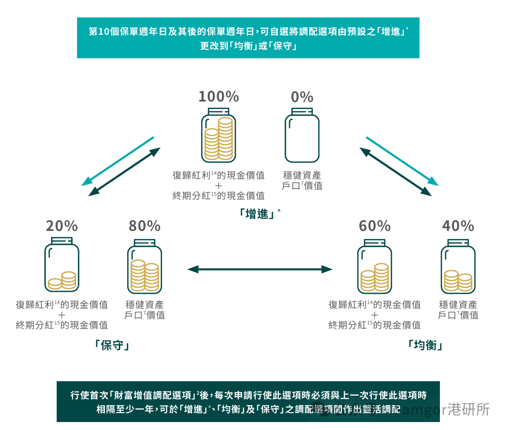 第10个保单周年日起,可灵活调配以下之组合比例: 分为「增进」、「均衡」及「保守」