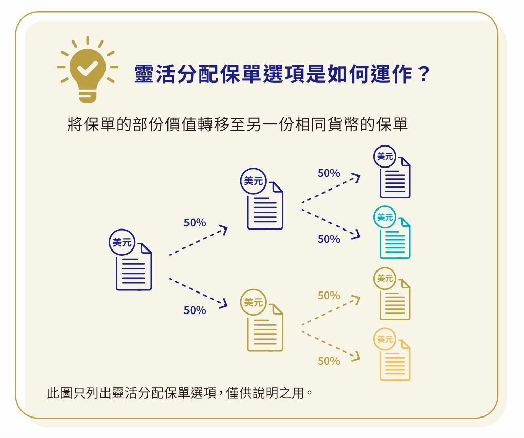 您可透过行使灵活分配保单选项,将保单部分价值转移至另一份保单,灵活适应您不断转变的财务需求。