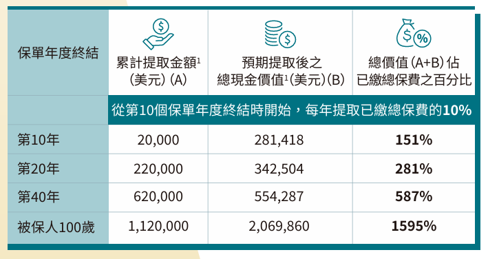 被保人 100 岁:累计提取 1,120,000 美元,提取后总现金价值 2,069,860 美元,占比 1595%。