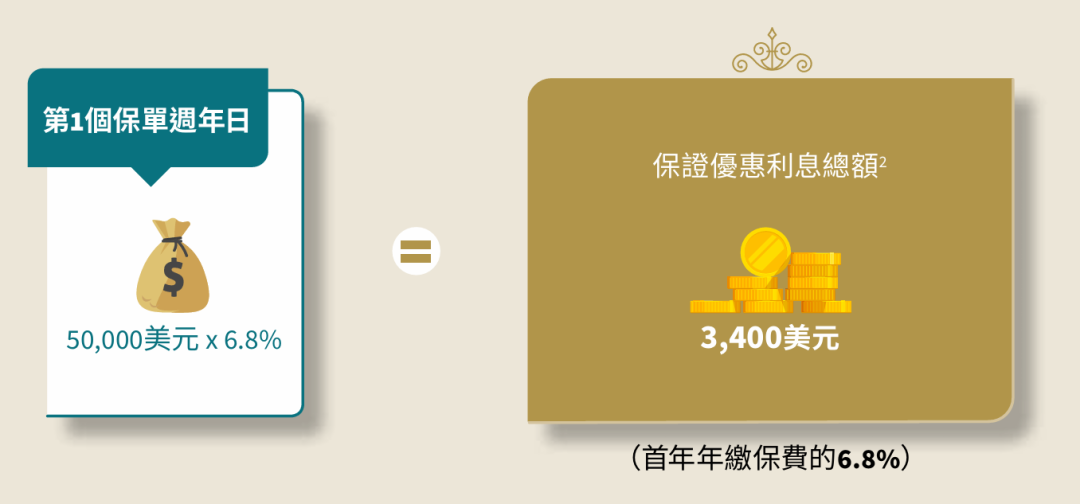从 2025 年 1 月 15 日至 2025 年 3 月 31 日期间,包括首尾两天,只需在投保全新【盛利储蓄计划】基本计划时,以美元作为保单货币,并一次性缴付相当于首次基本计划年缴保费 2 倍的金额,即可就预缴保费(定义如下)享年利率 6.8%的保证优惠利率,直至第 1 个保单年度结束。