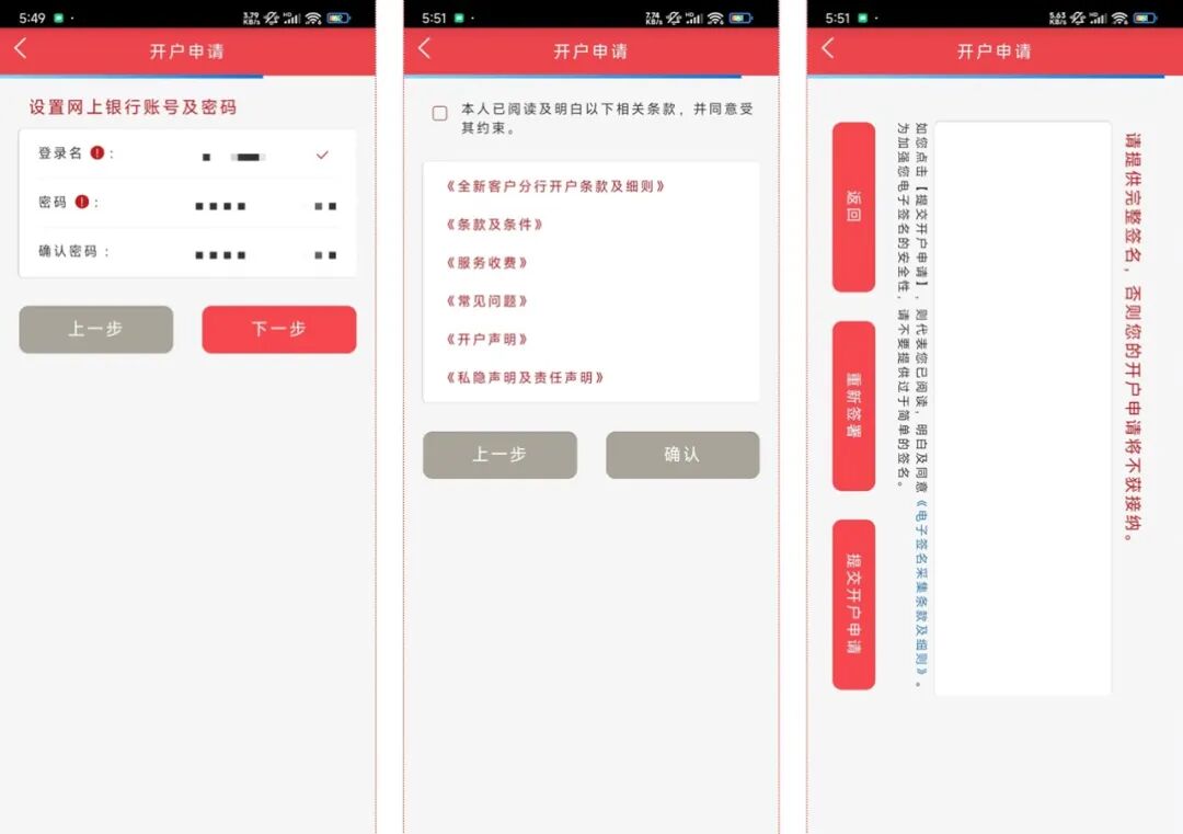 设置网上银行账号及密码点击下一步(注意用户设置条件)-核对资料正确无误后点击下一步-同意条款点击确认-横屏签署完整姓名提交开户申请。