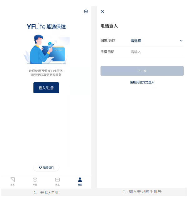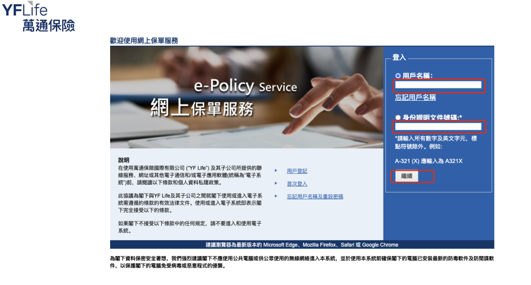 (1)登入 https://app.yflife.com/ePS/zh-HK/,从以下界面登入客户专页。