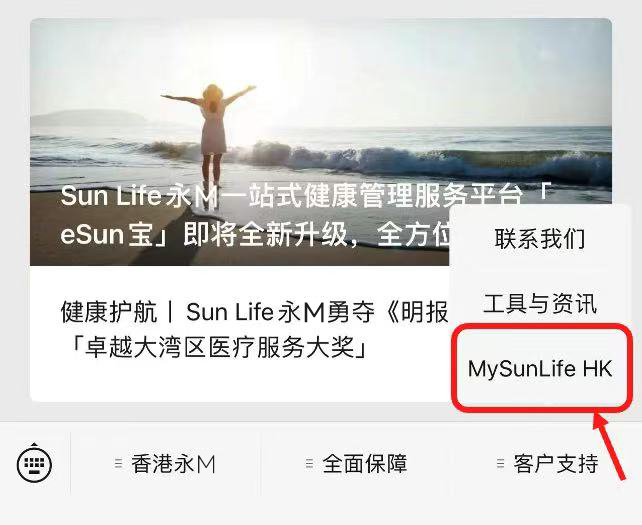 首先点击右下方的“客户支持”,然后在菜单上选择「My Sun Life HK」;
